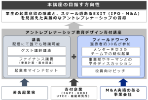 起業家などによる講義と、学生と事業会社社員がチームとなって課題に取り組むフィールドワークの複合型で進行する新しい教育フォーマットを構築します。